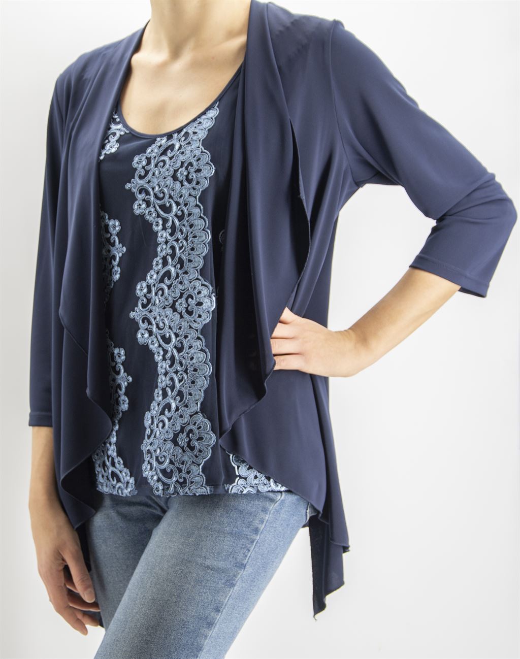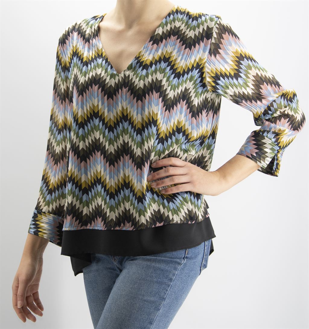Blusa elegante con scollo a v e manica trasparente ¾ con spacchetto dettaglio moda sul polsino. Fantasia geometrica multicolor con rifiniture in lamè dal tocco glamour. Effetto doppia canotta colore nero. Materiale: Poliestere